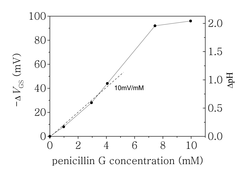 For the penicillin EnFET, penicillinase is immobilized on the Si3N4 gate dielectric. The functionalised ISFET detects the variation in H+ concentration, resulting from the catalysed hydrolysis of penicillin by penicillinase, which is dependent on the penicillin concentration in the solution [2,8]. Fig. 4a shows the voltage shift, measured in 5 mM, pH 7.0 phosphate buffer with different penicillin G concentrations. The I-V curves shifted to negative voltages for increasing penicillin concentration. The shift is linear with concentration until saturation reached at about 7 mM. The sensitivity is about 10 mV/mM. The pH sensitivity of this device is 47 mV/pH. Therefore the corresponding pH change induced by the penicillin hydrolysis can be calculated as shown in right axis.