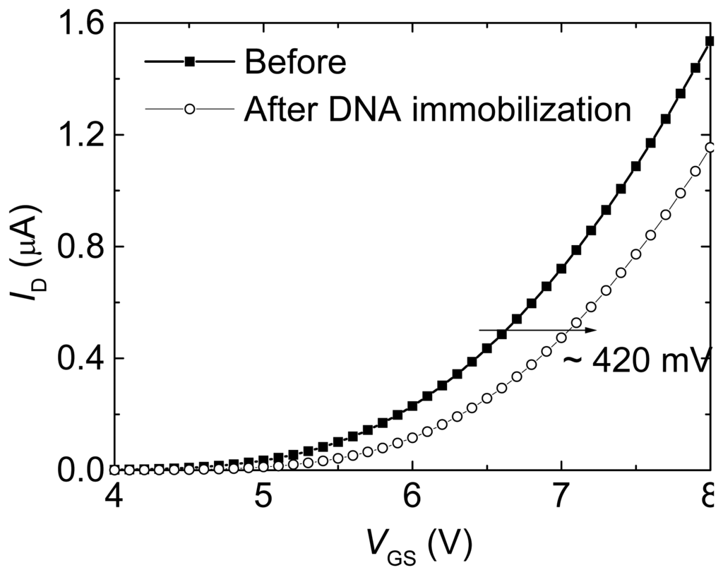 ID-VGS curve of a gold gate n-type ISFET with transistor size W/L = 40 μm/6 μm measured with VDS = 0.1 V in 50 mV phosphate buffer with pH 7.0, before and after single-stranded DNA immobilization.