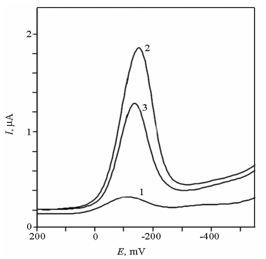 DP voltammograms of [Co(phen)3]3+ at SPE (1), ex situ prepared DNA/SPE before (2) and after (3) incubation in model cleavage mixture. Conditions: 5×10-7 mol/L [Co(phen)3]3+ in 5×10-3 mol/L phosphate buffer solution pH 7.0, 120 s accumulation at +0.300 V, scan rate 10 mV/s.