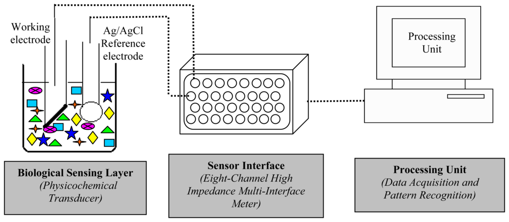 One Ag/AgCl reference electrode (Orion Research Inc., Switzerland) was used for each group of electrodes. The electrical potentials between the measuring electrodes and the Ag/AgCl reference electrodes were measured using Eight-Channel High Impedance Multi-Interface Meter (Fylde Scientific, U.K.). Prior to use, the electrodes were conditioned in 1mM KCl for one hour for better sensitivity and reproducibility [13] followed by washing with deionized distilled water. Then, the electrodes were left in the sample for one minute before taking reading for another minute. Each sample was measured three times. The electrodes were washed twice, each time for one minute and for each consecutive measurement with deionized distilled water to avoid charge carry over effect.
