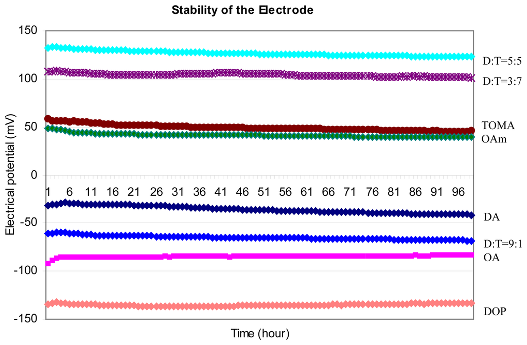 In order to determine the stability of the eight lipid membrane over a period of time at room temperature (25 ± 2°C), every 60 sec up to 98 hours or equivalent to four consecutive days in 1 mM KCl. The electrical potential of negative charge electrode DOP, DA and D:T=9:1 drift a little for the first one hour (Figure 2). The standard deviations of the electrode DA, OA, DOP, D:T=5:5, D:T=3:7, TOMA, OAm and D:T=9:1 electrical potentials were 0.42, 1.80, 0.97, 0.24, 0.32, 0.85, 0.50 and 0.52 respectively. After one hour, the electrode were almost stable and the standard deviation were 0.12, 0.05, 0.06, 0.13, 0.14, 0.24, 0.13 and 0.10 for DA, OA, DOP, D:T=5:5, D:T=3:7, TOMA, OAm and D:T=9:1 respectively. The standard deviation remains about constant till after 98 hours. Therefore, preconditioning for one hour in reference solution 1 mM KCl is a necessary step before sensor measurement enables repeatable results of sufficient accuracy to be obtained over an extended period of time. Beside this, sufficient ‘settling-down’ time or response time of about one minute to allow the system to come to equilibrium with the sample solution [17] before taking sensor reading is also an important factor that affecting the sensor performance.