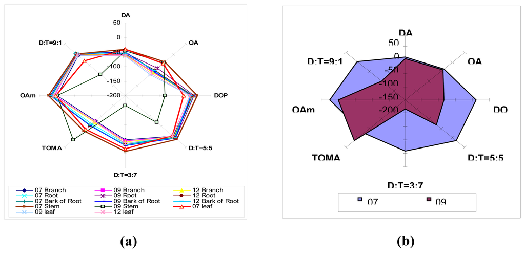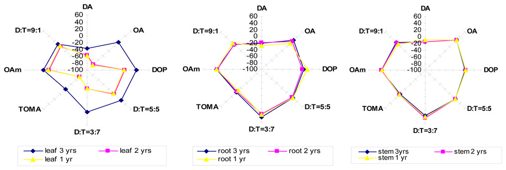 It is well documented that the level of the plant bioactive constituent may vary substantially depending on environmental and genetic factor [18–19]. Among others, species variation, growing conditions, time of harvesting and not to mention the production and processing of the phytomedicinal product are the determining factors for herbal quality. Therefore, monitoring of the different stages of maturity of different parts of plant of E. longifolia was carried out in this study. The typical potentiometric fingerprint profile of E. longifolia leaf, root and stem during different stage of maturity at one, two and three years of cultivation are shown in Figure 4. For a reasonable qualitative comparison, the scalar effect on the fingerprint profile was eliminated by plotting the radar plot using the same scale factor. At sensitivity level of the sensor measurement, young leaf samples with one and two years of cultivation have significant differences in chemical constituent compare to others. On the contrary, the fingerprint profiles of the matured leaves under three years of cultivation are similar to the other parts of plant that are root and stem. This result is in agreement with those reported [20] as total quassinoid content was noticeably lower in leaves as compared to other plant part (i.e. root and stem). Furthermore, an active principle for aphrodisiac properties namely eurycomanone was high in both root and stem but was found absent in leaves of E. longifolia extract.