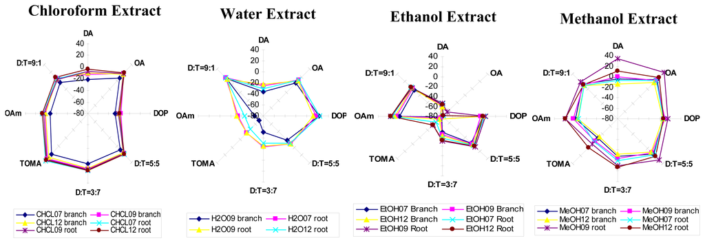 The radar plot in Figure 5 give good characterization of the solvent system used to extract the E. longifolia. Overall, significant differences of the potentiometric fingerprint of different solvent extract especially water and ethanol extract were recorded. As solvent polarity and solubility of the plant constituent in the solvent might altered the absolute concentration of the certain class of compounds (i.e. lipid soluble and water soluble) extracted during the extraction process. Correspondingly, different part of plant only contributed slight differences in the signal intensity as the chemical fingerprint are identical for both branch and root samples. Therefore, it can be concluded that solvent extract mainly contributed to variability of the phytomedicine chemical constituents, hence play an important role in extracting a certain biological active fractions present in a particular herbal medicinal plant. This study shows that the in-house developed potentiometric sensor is capable to be served as a fingerprinting device for qualitatively classifying the solvent extraction system.