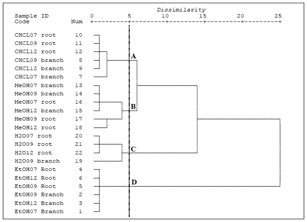 The dendogram in Figure 6 clearly shows that four distinct clusters (A-D) were form at similarity distance of five. In general, most of the samples tend to cluster together according to its solvent system rather than according to the part of the plant. This classification results were in agreement with the above potentiometric fingerprint pattern. As the five representative E. longifolia extracts namely chloroform extract, methanol extract, water extract and ethanol extract form cluster A, B, C and D respectively. Therefore, once again we can conclude that the polarity of the solvent play an important role in determining the extraction of a certain bioactive fraction of the herbal extract. For example, water extract from the E. longifolia is use for its male aphrodisiac properties [22] whereas the methanol extract is intently used for antimalarial and antiplasmodial activity [23].