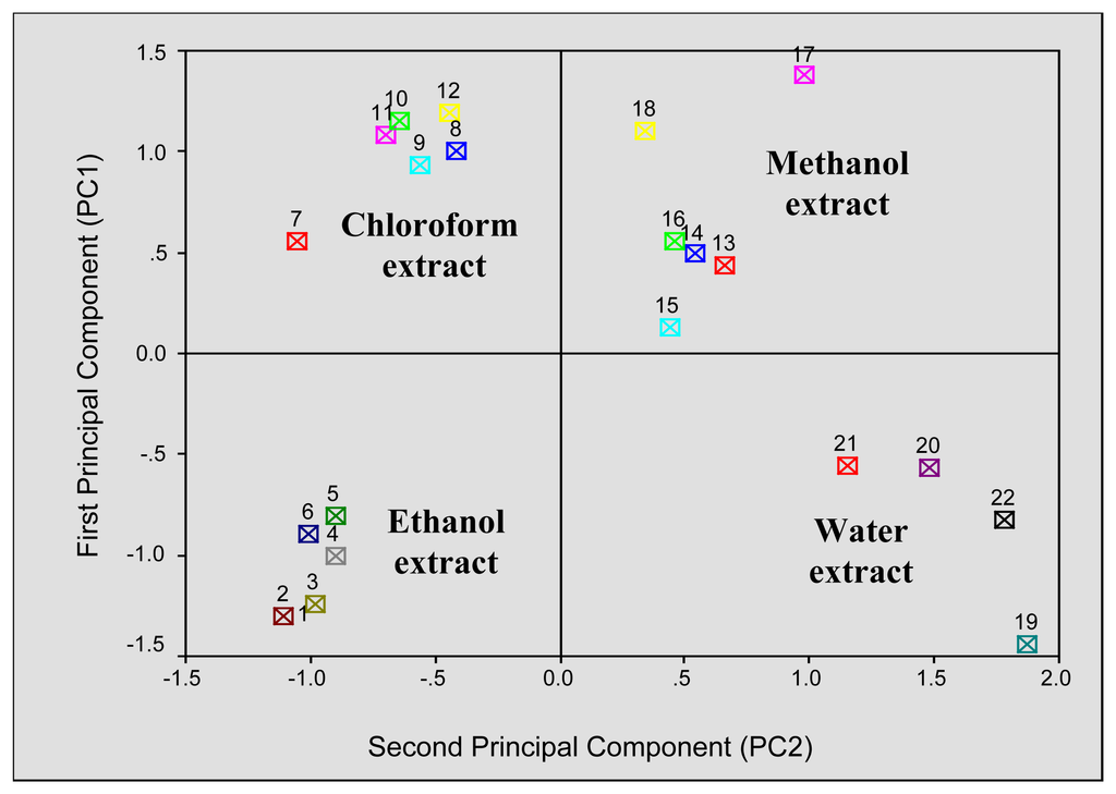The scores plot of various solvent extract E. longifolia samples in two dimensional spaces.