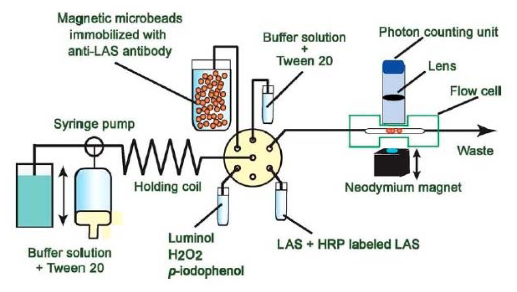 In recent years, a sequential injection analysis using micro-magnetic beads was introduced for many immunoassay studies. Soh, et. al. [127] developed a sensitive immunoassay method for the determination of vitellogenin. The system involved a sequential injection analysis system coupled with a chemiluminescence detector and a samarin-cobalt magnet. The micro-magnetic bead and sequential injection was also used for the determination of anionic surfactants [128]. A schematic diagram of the sequential injection system using magnetic microbeads is shown in figure 5. Moreover, Kradtap Hartwell et. al. have also utilized the sequential injection-ELISA based system for online determination of hyaluronan [129].
