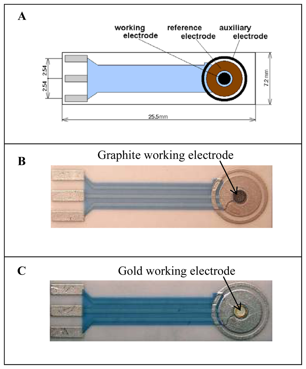 Thick-film technology (TFT) sensor design (A) and real TFT sensor with reference (Ag/AgCl) electrode, carbon auxiliary electrode and graphite (B) or gold (C) working electrode.