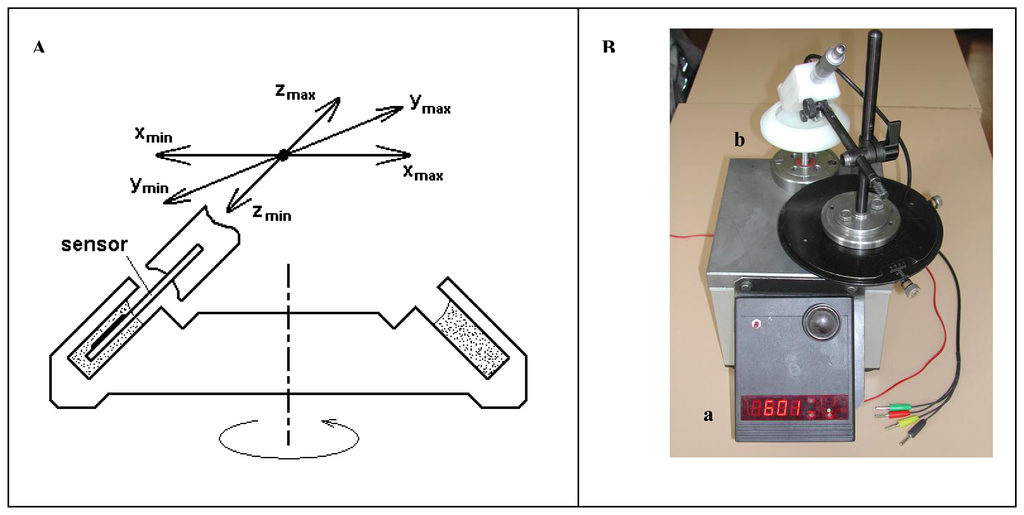 Scheme of the suggested device (A). Photography of prototype of new electrochemical device (B) revolution regulator (a) and positioning of the sensor, fine 3-axis positioning of the sensor (b).