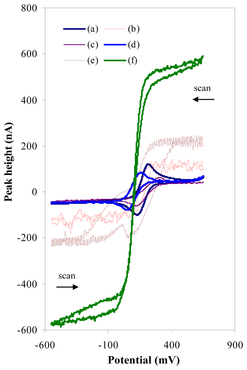 Cyclic voltammograms of 0.1 M potassium ferrocyanide-ferricyanide measured by TFT sensor with gold working electrode at different arrangements of electrochemical analysis in combination with flow of background electrolyte: (a) non stirred arrangement; (b) continual stirred arrangement; (c) application peristaltic pump at flow of 0.4 ml/min; (d) microperistaltic pump at flow of 100 ΞΌl/min; (e) micro-flow system at flow of 10 ΞΌl/min; (f) rotating vessel at 175 rpm. Background electrolyte 0.1 M KCl. CV parameters were as follows: the initial potential of -550 mV, the end potential 650 mV, scan rate 25 mV/s. Working electrode surface area: 2.075 mm2, the working volume of the background electrolyte was 10 ml. For other details see βExperimentalβ section.