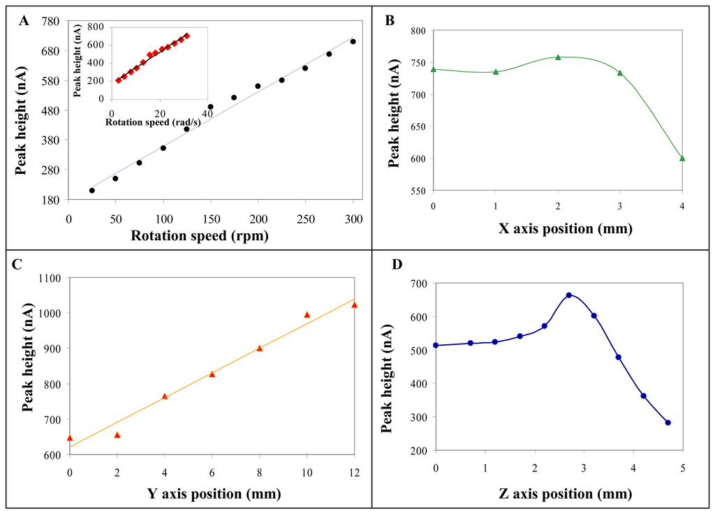 Changes in peak height of 0.1 M potassium ferrocyanide-ferricyanide measured by TFT sensor gold working electrode at different conditions: rotation speed (rpm), in inset: (rad/s) (A); x axis position (B); y axis position (C); z axis position (D). For other details see Fig. 3 and βExperimentalβ section.