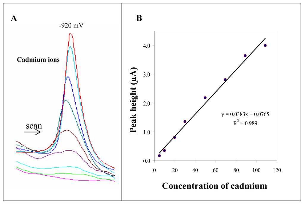 The differential pulse voltammetry (DPV) was used for detection of cadmium. DPV parameters were as follows: the initial potential of 0 mV, the end potential β1100 mV, the modulation time 0.057 s, the time interval 0.2 s, the step potential 1.05 mV/s, the modulation amplitude of 25 mV.