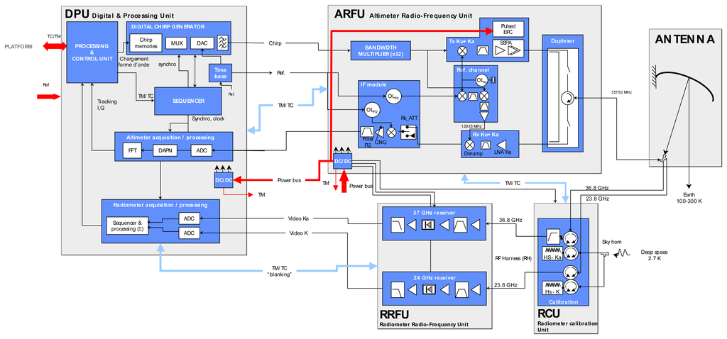 The main instrument of the payload is the Ka-band radar altimeter. This altimeter is derived from the Poseidon altimeter and operates at 35.75 GHz. A dual frequency microwave radiometer (23.8 and 36.8 GHz) is embedded in the altimeter. A detailed description of the altimeter / radiometer instrument is given in section 6.