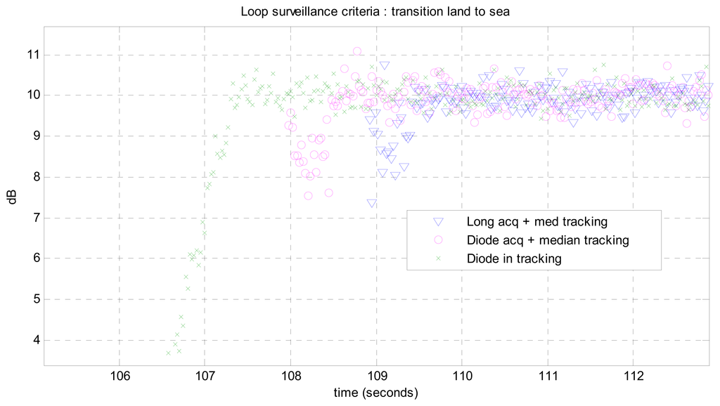 Comparison of tracker behavior in a land to sea transition with several options (Vertical axis: SNR in dB, Horizontal axis: time).