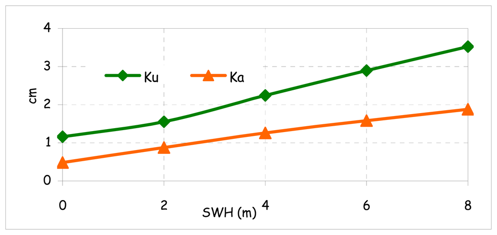 In terms of significant waveheight, noise at 2 m is less than 5 cm for a 2 m SWH, and remains less than 8 cm for a 8 m SWH.