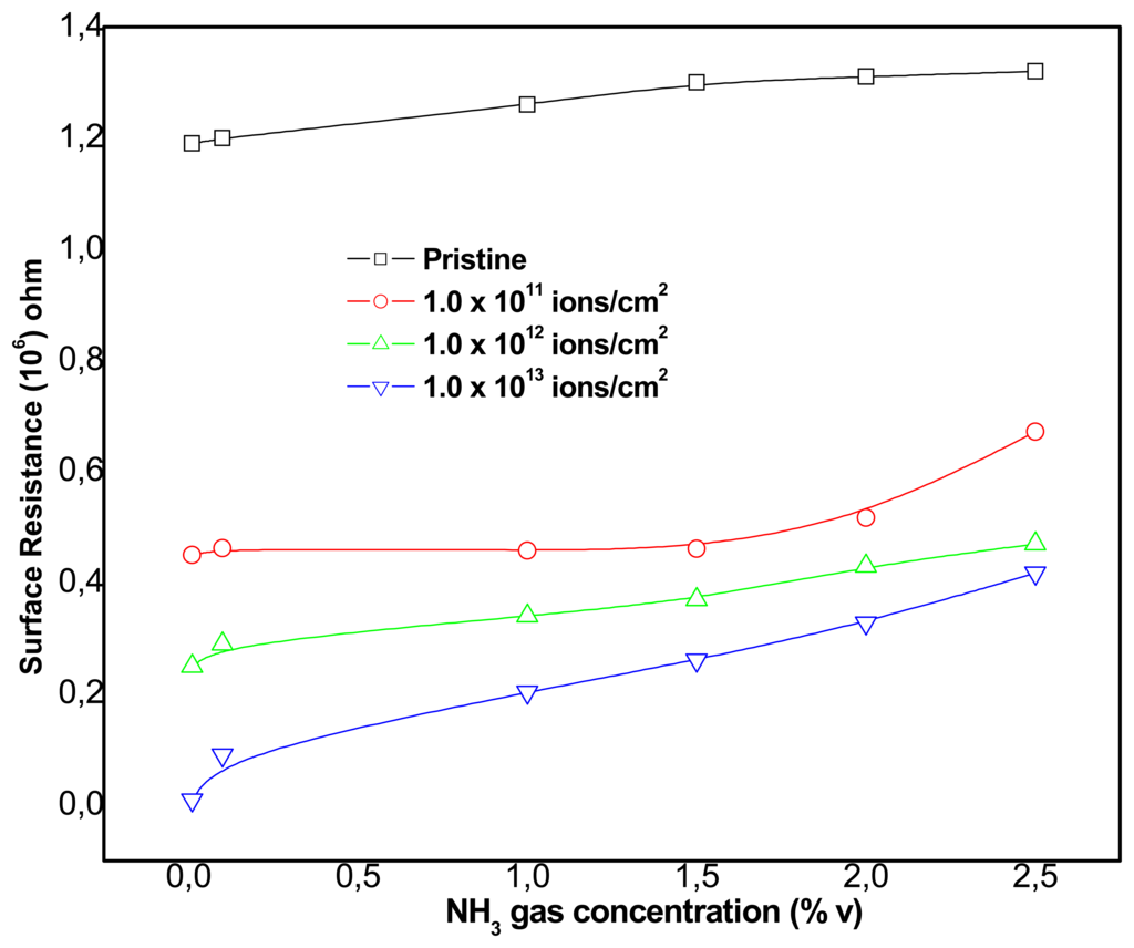 The detection sensitivity of the sensors was determined by studying the surface resistance as a function of the concentration of ammonia gas under similar ambient condition. The surface resistance of the films both pristine and the irradiated was plotted as a function of the concentration of ammonia gas in percent volume in Figure 3.