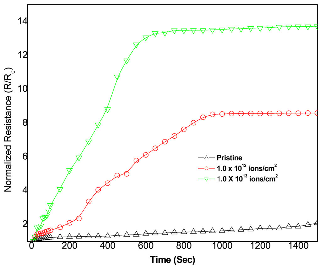 It is clearly observed from Figure 3 that the surface resistance of the films decreases with increasing ion fluence at any given concentration of ammonia and is reduced by nearly two orders of magnitude (106 ohm to 104 ohm) due to ion irradiation. It is further observed that the resistance of the irradiated samples exposed to different concentration of ammonia gas increased slightly more steeply than that of the pristine sample. The electrical response of the composite films exposed to ammonia is shown in Figure 4 in terms of the normalized resistance as a function of time for the pristine film and the films irradiated with total ion fluence of 1.0 × 1012 and 1.0 × 1013 ions/cm2, respectively. The study on the temporal behaviour of normalized resistance indicates that the irradiated composite films have a slightly quicker response than that of pristine. It could be perhaps due to the irradiation-induced porosity in the composite films, which results in faster adsorption of ammonia vapours. As ammonia vapours interact with the electrophilic site of the polymer, it captures the protons followed by the chloride ions from iminonitrogen to form uncharged polymer (EB form) and ammonium chloride. This results in an increase of the resistance of the polymer composite films on exposure to ammonia vapours. Therefore, it can be stated that the increased sensitivity and better response time in the case of irradiated composites could perhaps be due to the structural modification taking place in the polymer material as a result of heavy ion exposure, which leads to more efficient diffusion of ammonia gas in the composite matrix.