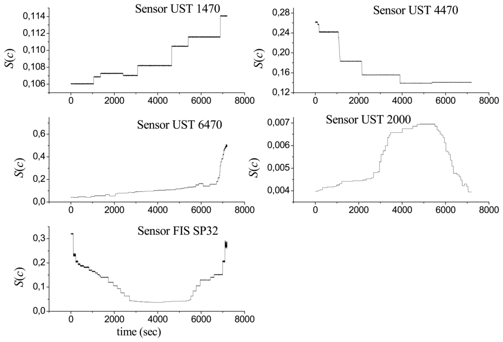 Fig. 5 shows the input signals for the gas sensor array. Different input signal profiles were considered, e.g. rising or sloping characteristic curves and a combination of both. The used sensors are differently strongly main and cross-sensitive to the gases and therefore, the calculated respective gas concentrations are differently corrected by the cross sensitivities. While the gas sensors 1470 and 2000 exhibit very strong cross-sensitivities to the gases H2 and C2H5OH, respectively, the sensors 4470, 6470 and SP32 show rather weak cross-sensitivities to their “cross gases”. Therefore, the sensor array is strongly influenced by the gases H2 and C2H5OH and thus, high gas concentrations of the gases CH4 and CO are estimated.