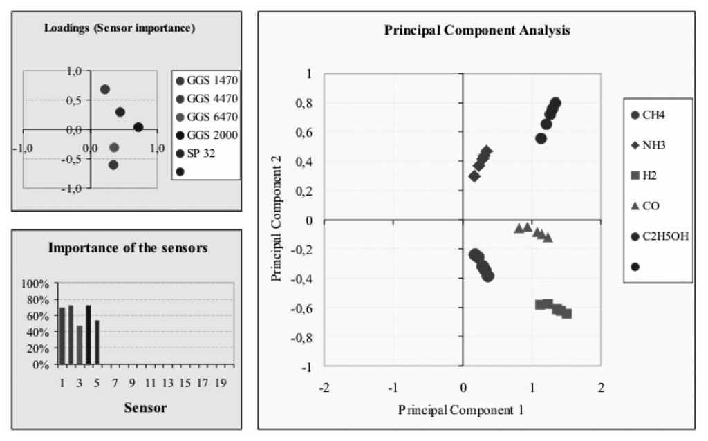 With the loadings of the principal components it is possible to find out which sensor of the sensor array is best suitable for the discrimination of the gases. When the sensitivities of the sensors are not large enough, then it is possible that the gases are not discriminated correctly, which means that the sensors are too similar in their cross-sensitivities.
