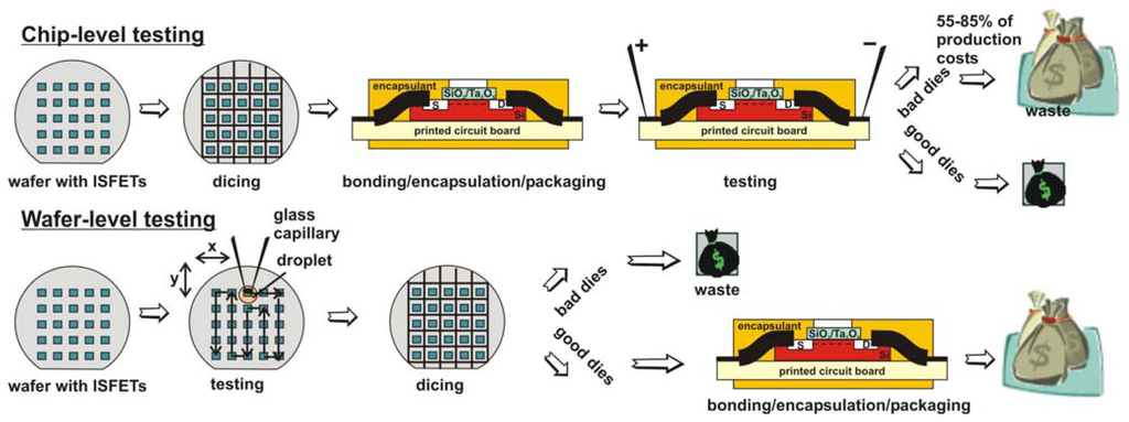 A wafer-level functionality testing system for ISFETs has been realised by means of integration of a specifically designed capillary electrochemical micro-droplet cell into a commercial wafer prober-station. The obtained experimental results demonstrate also the feasibility of the developed system for the wafer-level characterisation of ISFETs in terms of sensitivity and hysteresis. The developed system allows to identify and select “good” ISFETs at the earliest stage of the fabrication process and to avoid expensive bonding, encapsulation and packaging processes for non-functioning ISFETs and thus, to decrease costs, which are wasted for bad dies. In addition, a single non-encapsulated ISFET can be tested and characterised. Furthermore, the system might be also utilised for wafer-level testing of further electrochemical sensors. In the future, we plan to automatically scan the microcell over the whole wafer surface (as it is shown in Figure 1) for a fast testing of all sensor structures.
