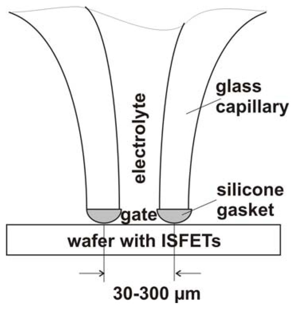 The designed capillary micro-droplet plexiglass-cell is based on a conventional three-electrode arrangement (Figure 4). The reference (Au wire or Hg/HgCl2) and counter (Au wire) electrodes are connected by the glass capillary filled with the electrolyte. A silicone gasket has been formed on the flat glass-capillary tip, which has been prepared by previous laser pulling and mechanical polishing. The hydrophobic surface of the silicone gasket prevents leakage of the electrolyte. Prior to measurements, a droplet of an electrolyte solution is applied on the die under test, exclusively covering the gate region of the respective ISFET. The contact area of the gate with the electrolyte is defined by the diameter of the silicone gasket. Because of the adjustable geometry of the tip size of the capillary, the rest of the ISFET has no contact to the electrolyte.