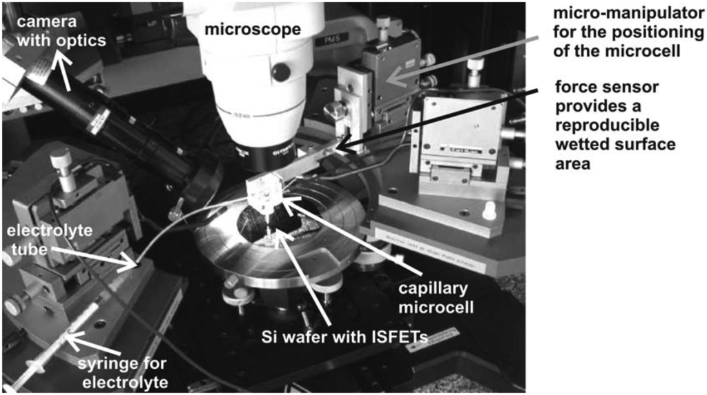 The developed wafer-level testing system for ISFETs is shown in Figure 3. It combines the following basic parts: A commercial wafer prober-station (PM5 from Süss Microtec), a capillary micro-droplet cell, a semiconductor parameter analyzer (4155C from Agilent) or home made 4-channel ISFET-meter (not shown), a micromanipulator for the positioning of the microcell, and a microscope for optical control. An additional video microscope is used to control the droplet size, the contact between the surface and the filled glass capillary, and the position of the capillary onto the gate region. A constant mechanical contact pressure and thus, a reproducible wetted surface area has been achieved using a force sensor (KD45 from ME-Messsysteme GmbH, Germany), which monitors the force between the capillary tip and the wafer surface, digitizes the value and transfers it to the computer [,]. The computer can check whether the capillary is in contact with the wafer or not.