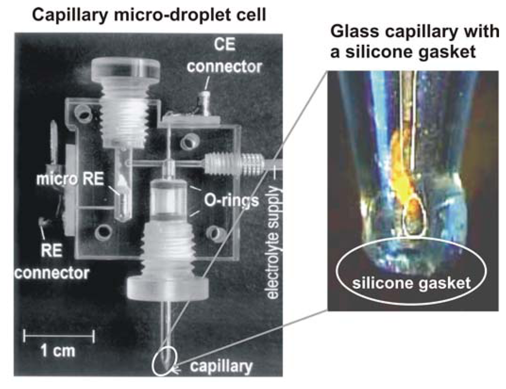 Capillary microcell for spatially resolved electrochemical measurements on wafer level. A silicone gasket at the tip of the capillary defines the testing area.