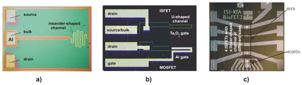 Layouts of different ISFET chips consisting of a single ISFET with a meander-shaped channel (a), an ISFET/MOSFET (metal-oxide-semiconductor FET) pair with an U-shaped channel (b) and four ISFETs and one MOSFET with a linear-shaped channel (c).