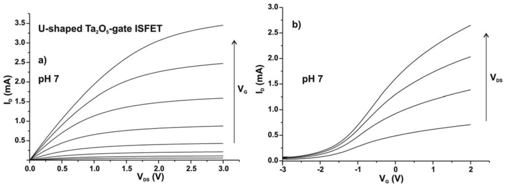 To test the functionality of the ISFETs, a buffer droplet of pH 7 was applied to the gate area of the selected ISFET on the wafer by means of the micro-droplet cell, and a set of output and transfer curves has been recorded using a semiconductor parameter analyzer or a home-made ISFET-meter. Dependent on the ISFET layout and the size of the gate area (see Figure 5), capillaries with different diameters have been used. As an example, Figure 6 exemplarily shows a typical set of output (a) and transfer (b) curves of a U-shaped Ta2O5-gate ISFET (layout (b) in Figure 5). They are comparable to those that have been measured on chip-level with fully encapsulated ISFETs, i.e. after the complete fabrication process.
