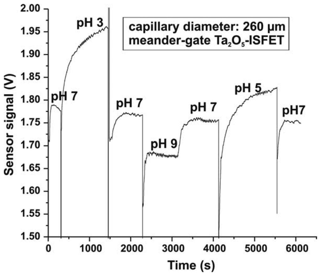 In addition to functionality tests, the developed system allows also a wafer-level characterisation of ISFETs in terms of pH sensitivity or hysteresis by applying buffer droplets with different pH values to the gate surface. Prelimanary experiments have verified the possibility to perform such measurements with the developed micro-droplet cell. As an example, Figure 7 represents a constant-charge-mode dynamic response for a meander-shaped Ta2O5-gate ISFET (layout (a) in Figure 5) in buffer solutions of different pH values from pH 3 to pH 9 measured on wafer level by means of the developed experimental set-up with the micro-droplet cell. The pH sensitivity evaluated from Figure 7 was about 50 mV/pH (in comparison to 55-58 mV/pH for the encapsulated Ta2O5-ISFET []). At the same time, a relatively large hysteresis and a longer response time have been observed that can be attributed to rests of the previous buffer solution due to difficulties of careful rinsing of the capillary and the ISFET-gate surface as well as due to the possible presence of micro-bubbles in the gate region. These disadvantages could be avoided by using a flow-through capillary micro-droplet cell, which has been recently proposed in []. Here, a continuous electrolyte flow might allow an easy and careful rinsing of the micro-droplet cell and the gate surface as well as a faster change of different pH buffer solutions.