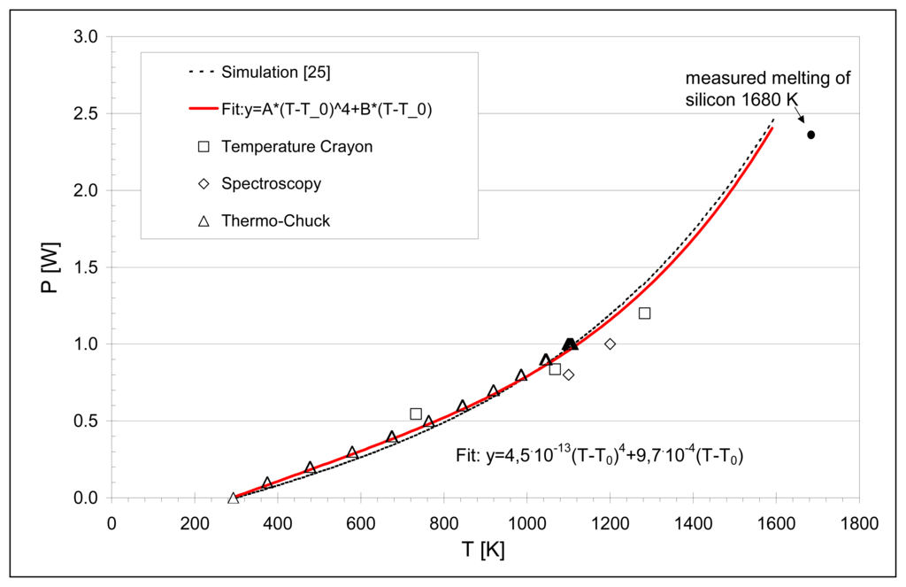 Bearing IR emitter applications in mind, relatively large hotplates were designed with heated areas as large as 1500 x 1500 μm2. For this reason our hotplates do not conform to the low power consumption values of our previously designed hotplates where we aimed at gas sensing applications [4]. Instead of the 50 – 100 mW power consumption at 700 K there, the power consumption of our present devices amounts to about 500 mW at this same temperature. Fig. 4 below shows that the power consumption increases roughly linearly from room temperature (T0 ∼ 290 K) up to about 800 K. Thereafter - up to the melting point of the Si support structure - the power consumption increases in a supra-linear fashion with (T – T0) due to a dominating increase of IR radiation. As indicated in Fig. 4, a temperature calibration of the hotplate devices had been performed by a number of independent techniques. In the first set of measurements, the devices were passively heated on a thermo chuck and the built-in Pt thermometer was used to measure the membrane temperature (triangles); in the second kind of measurement, the devices were actively heated and the melting points of special temperature-indicator crayons (squares) were used to assess the membrane temperature; in the third set of measurement, IR emission spectroscopy (diamonds) was used to estimate the membrane temperature. Results of all tree measurement principles have been included to create the polynomial fit shown as solid line in Fig. 4. The plot exhibits that every measurement method reproduced comparable values of the membrane temperature, consistent with a thermal resistor modelling of the hotplate structures [25].