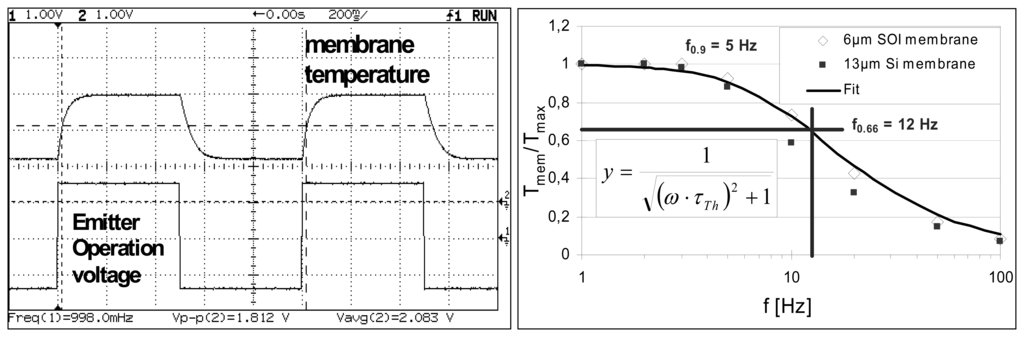As shown in Fig. 5, measurements of the cut-off frequency were performed by measuring the membrane temperature Tmem as a function of the modulation frequency. Devices with two different values of the membrane thickness (6 μm, 13 μm) were evaluated. From these measurements a cut-off frequency of 12 Hz at 70% modulation depth was revealed.