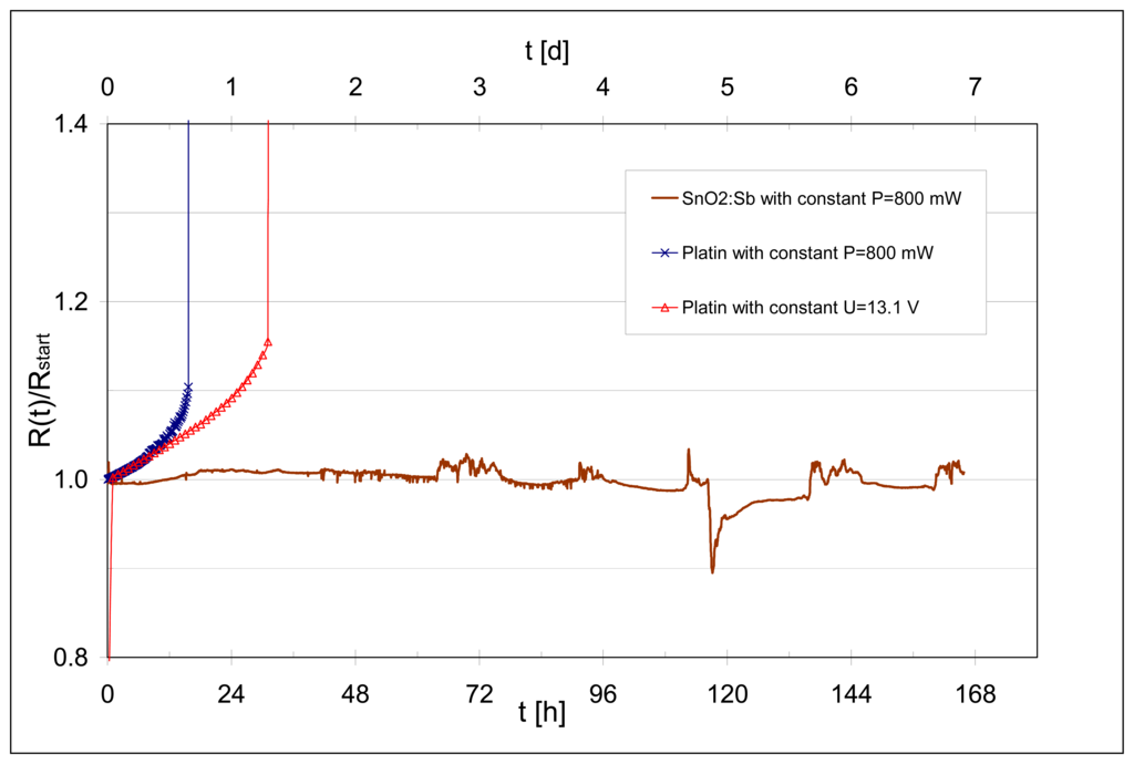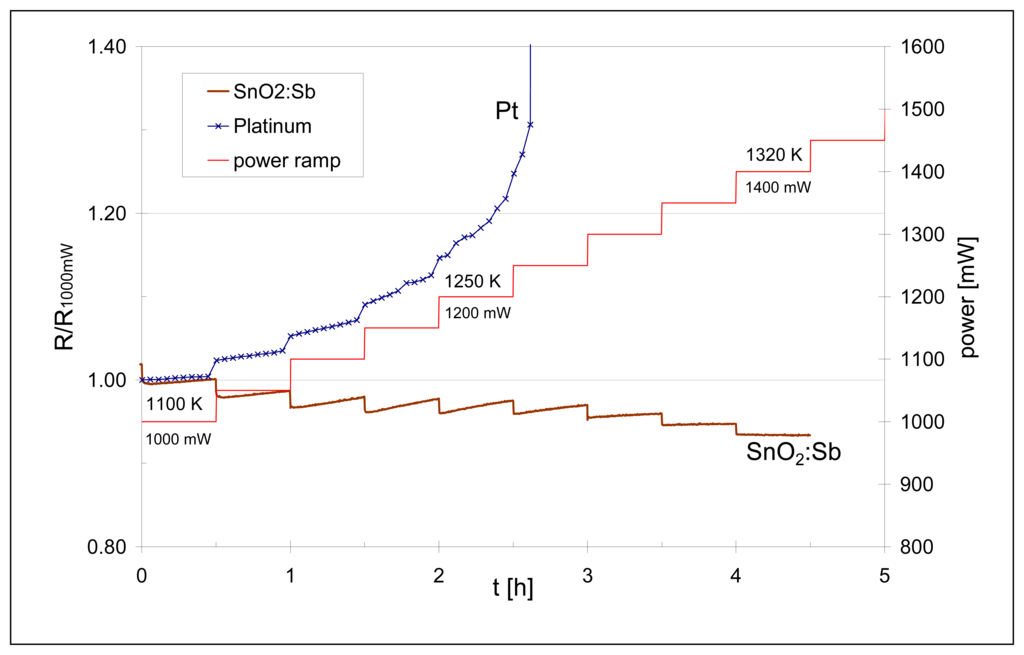 Accelerated aging tests of Pt (upper curve) and SnO2:Sb (lower curve) heater elements in air. Increased temperature (el. input power) leads to a rapidly increasing Pt degradation, whereas SnO2:Sb emitters can be operated up to temperatures in the 1300 K range demonstrating the superior performance of SnO2:Sb based heater elements. The seeming instability at lower temperatures is due to adsorption/desorption effects at the SnO2:Sb surface.