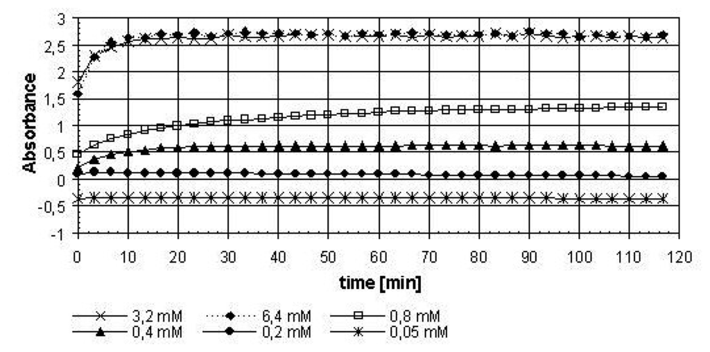 +), relation between the composition and concentration of the buffer solution and the kinetics of the enzymatic reaction were investigated. The absorbance level (OD) for the samples at the wavelength specific for the product of the enzymatic reaction NADH (340 nm) was recorded in 2.5 min intervals. As an example, the kinetic curves for different concentrations of the cofactor (0.05 – 6.4 mM) at a constant activity of phenylalanie dehydrogenase (2 U/200 μl) in glycine buffer solution with a concentration of 176 mM and pH 10.56 are shown in