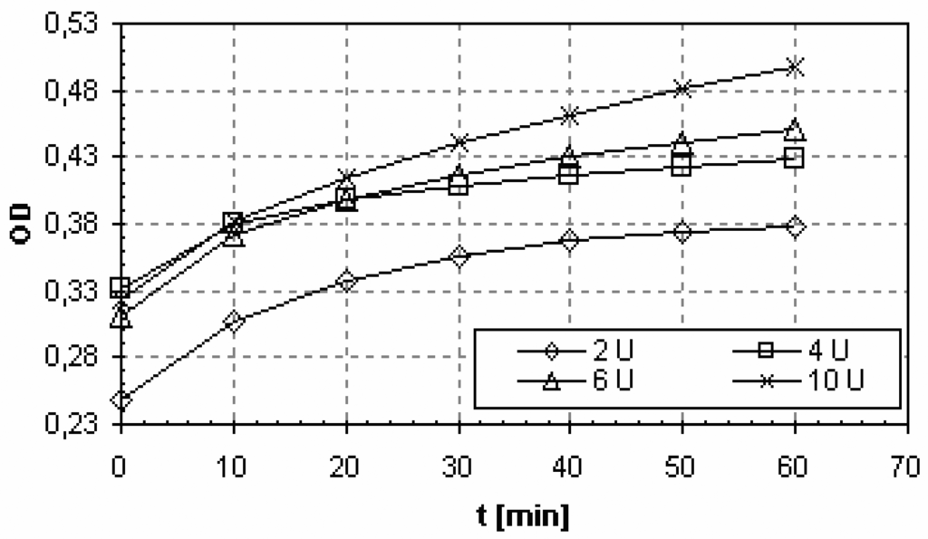 As it can be seen, the highest absorbance level was obtained for the glycine buffer solution and the enzyme content of 1.6 U/200 μl.