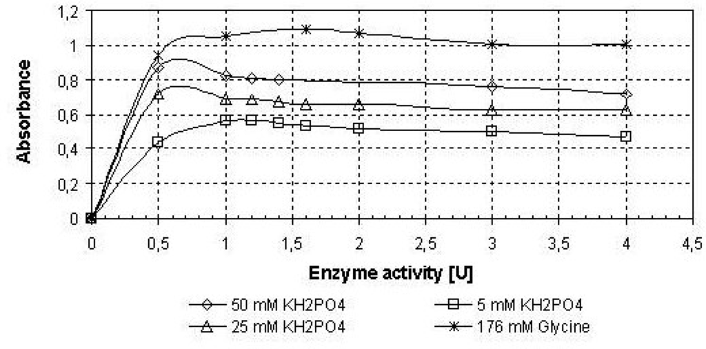 The influence of the enzyme amount (0.4 - 4 U/200 μl) and the buffer composition and concentration: phosphate buffer KH