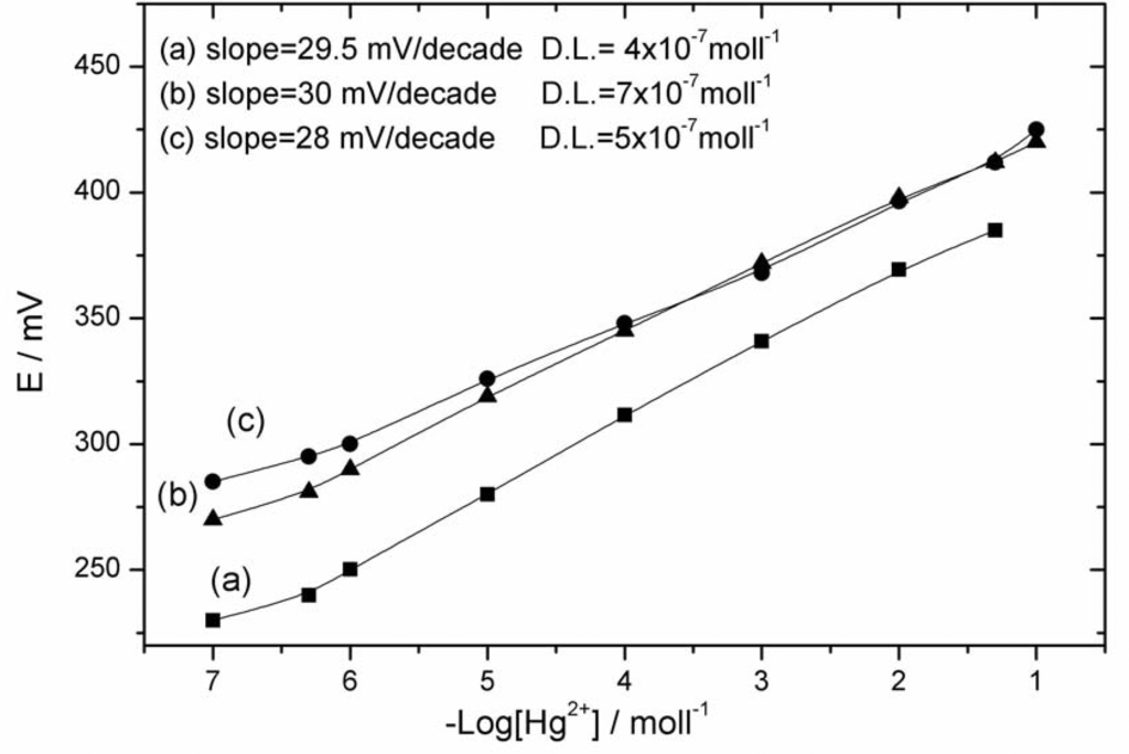 Potentiometric calibration graph of mercury-sensitive electrodes; (a: graphite rod, b: Au microsensor, c: Pt microsensor).