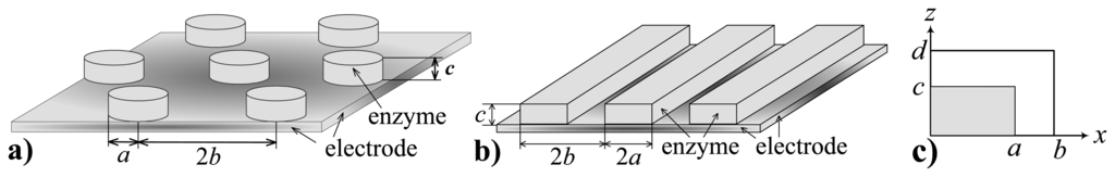 We investigate two shapes of the enzyme microreactors immobilised on a single electrode. In the case of the first type of the biosensor geometry, the microreactors were modeled by identical enzyme filled right cylinders. Fig. 1a shows a biosensor system, where the enzyme cylinders of radius a and height c are arranged in a rigid hexagonal array. The distance between the centres of two adjacent cylinders equals 2b.