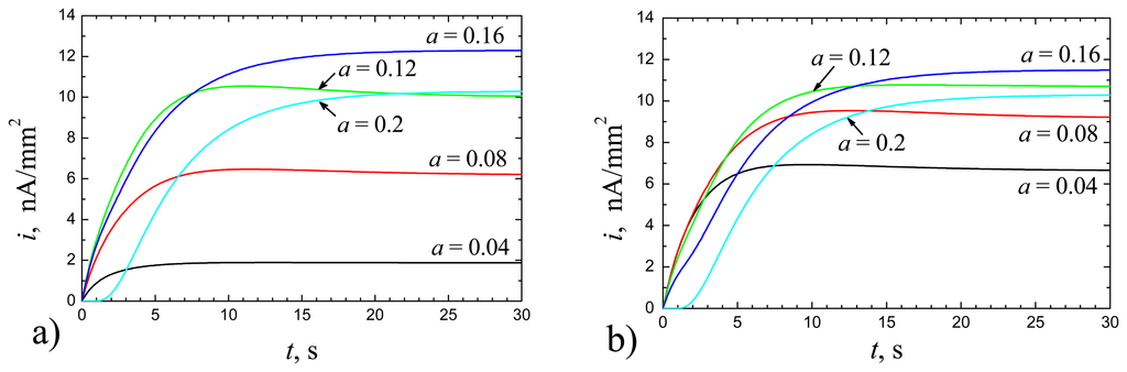 Using numerical simulation, the influence of the geometry of the enzyme microreactors on the steady-state current was investigated. Firstly, we calculated values of the biosensor current at different values of the half-width a of the enzyme microreactors keeping all other parameters constant. Fig. 2 shows the dynamics of the biosensor current i at the height c = 0.1 mm of the microreactors, b = 2c = 0.2 mm, d = c + δN = 0.12 mm, Vmax = 100 μM/s, S0 = 20 μM and five values of the half-width a of the microreactors: from 0.2b to b. The enzyme microreactors were modeled by cylinders (Fig. 2a) and by strips (Fig. 2b).