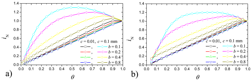 The variation of the half-width b of the entire unit keeping θ and c constant does not change the volume of the microreactors. Since iN varies with b (Fig. 3), the biosensor response depends also on the shape of the enzyme microreactors not only on their volume. The smaller value of b corresponds to the denser distribution of the enzyme microreactors on the electrode surface. The denser microreactors are distributed the higher the steady-state current is generated.