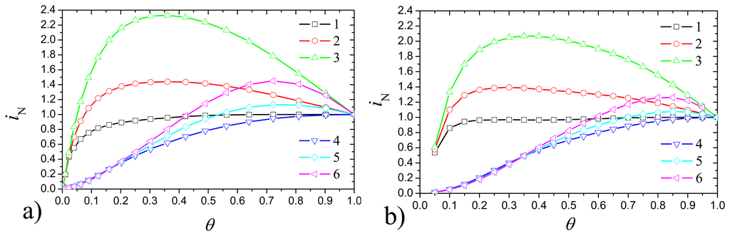 The normalised steady-state current iN versus the degree θ of electrode coverage at three values of the external diffusion coefficient Db: De (1, 4), 2De (2, 5) and 4De (3, 6) two maximal enzymatic rates Vmax: 10 (4-6) and 1000 (1-3) μM/s in the cases of cylinders (a) and strips (b), b = c = 0.1 mm, d = c + 0.02 mm, S0 = 20 μM.