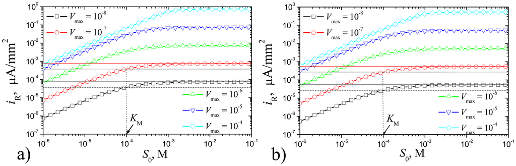 In the case of very high substrate concentration, S0 ≫ KM, the stationary current is expressed as follows [28]:
