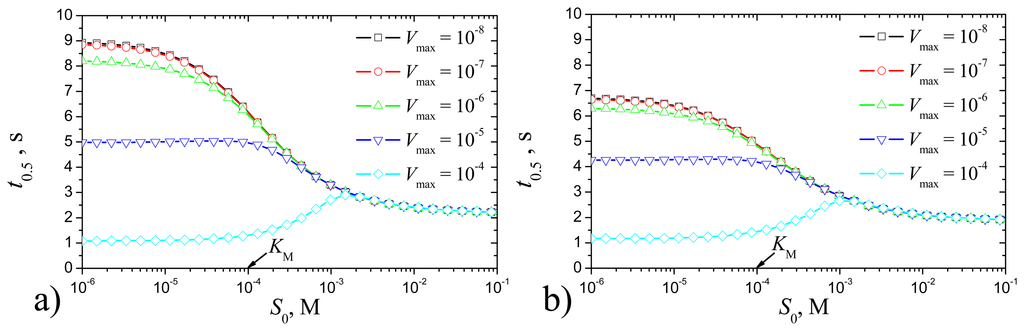 The half time t0.5 of the steady-state biosensor response versus the substrate concentration S0 at different values of the maximal enzymatic rates Vmax (M/s) in the cases of cylinders (a) and strips (b); values of other parameters are the same as in Fig. 5.