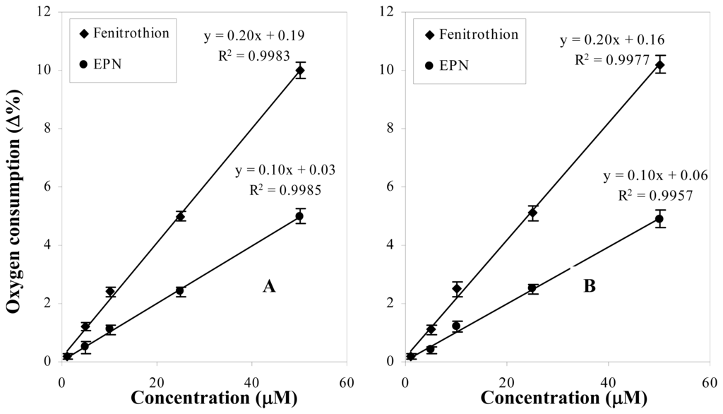 Figure 1A shows the dependence of the biosensor response on fenitrothion and EPN concentrations in operating buffer. As shown, the biosensor had a wide dynamic range with the oxygen consumption and a linear function of the pesticide concentrations up to 0.05 mM. The sensitivity (slope) of the microbial biosensor was 0.20% oxygen consumed per μM and 0.10% oxygen consumed per μM for fenitrothion and EPN, respectively.