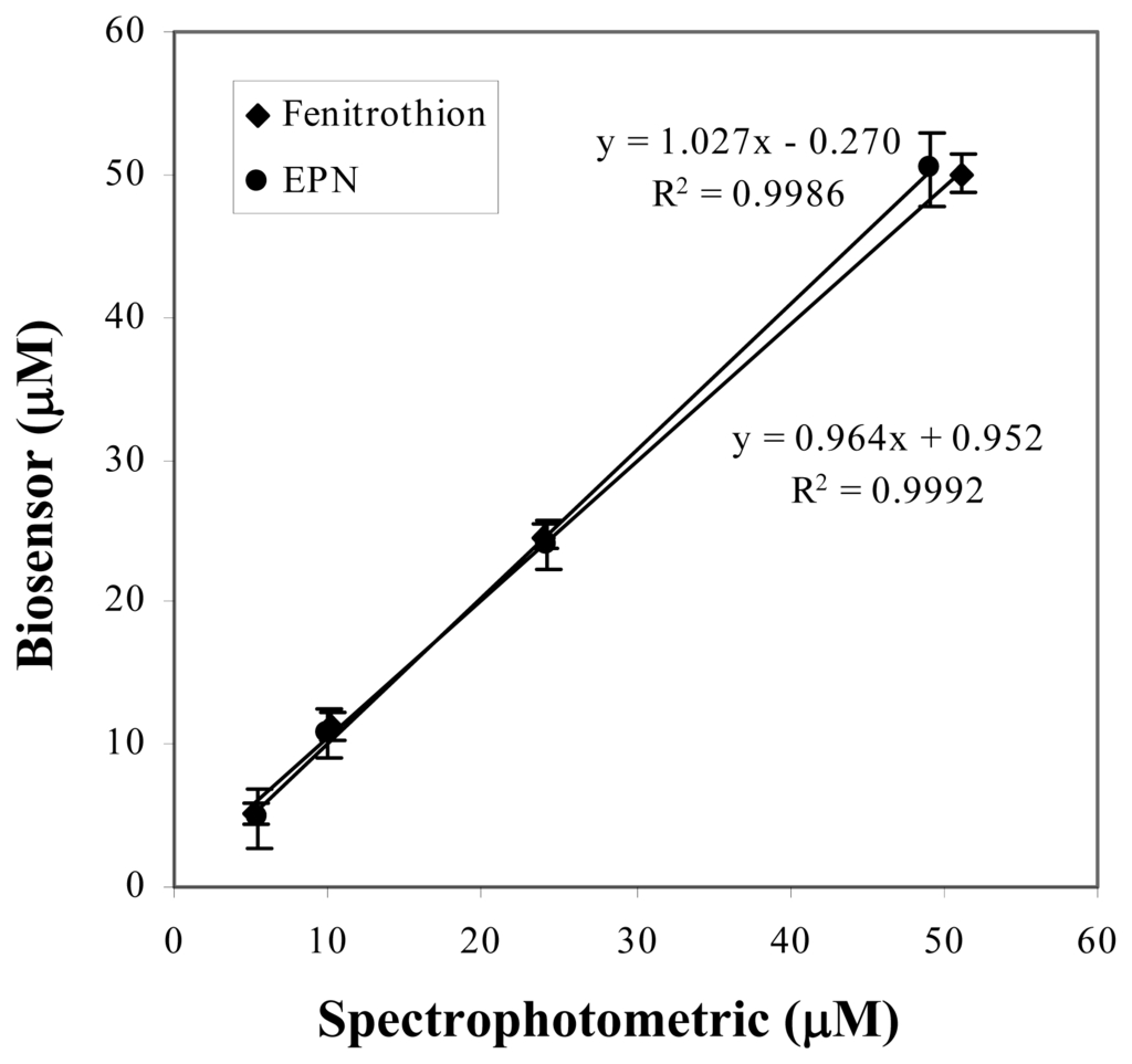 Accuracy of microbial biosensor. Fenitrothion and EPN as target compounds and operating in 50 mM pH 7.5 citrate-phosphate buffer with 50 μM CoCl2 at room temperature, with 0.086 mg cell loading. Data are given as mean ± 1 standard deviation for three experiments.