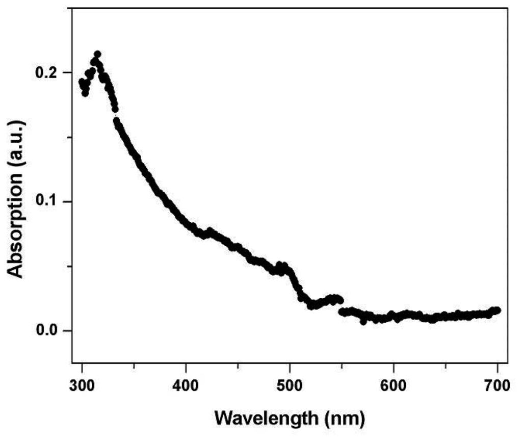 Figures 9 and 10 show the spectra obtained for sample 1 with the microphone and the LDR respectively. The use of the glass window on the microphone limits the spectral range used to wavelengths higher than 350 nm. LDR has not limitation and its spectrum beginning at 300 nm. Both spectra present absorption peaks at same positions: 420 nm and 490 nm. LDR spectrum at Fig. 10 also shows a peak at 314 nm. Figure 9 shows a noisy spectrum and Fig. 10 shows a spectrum with less noise, that permits a better identification of the absorption peaks position.