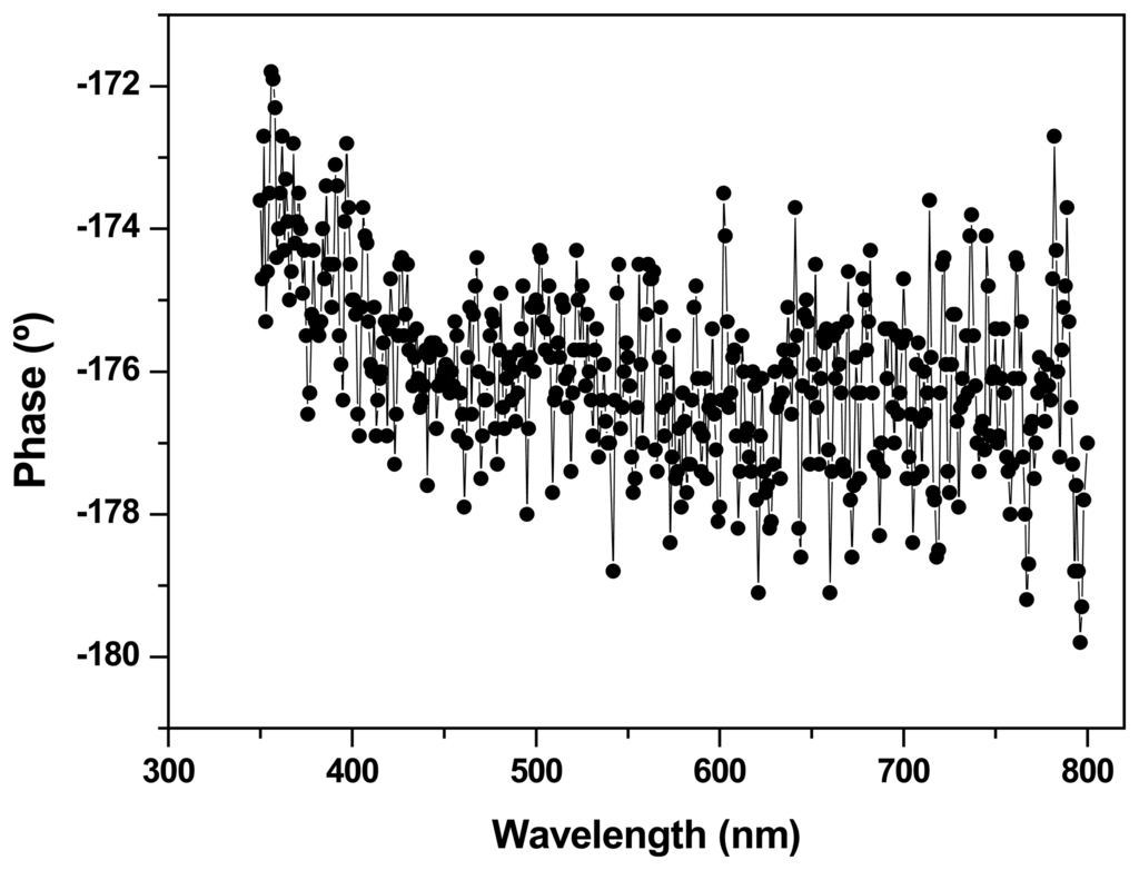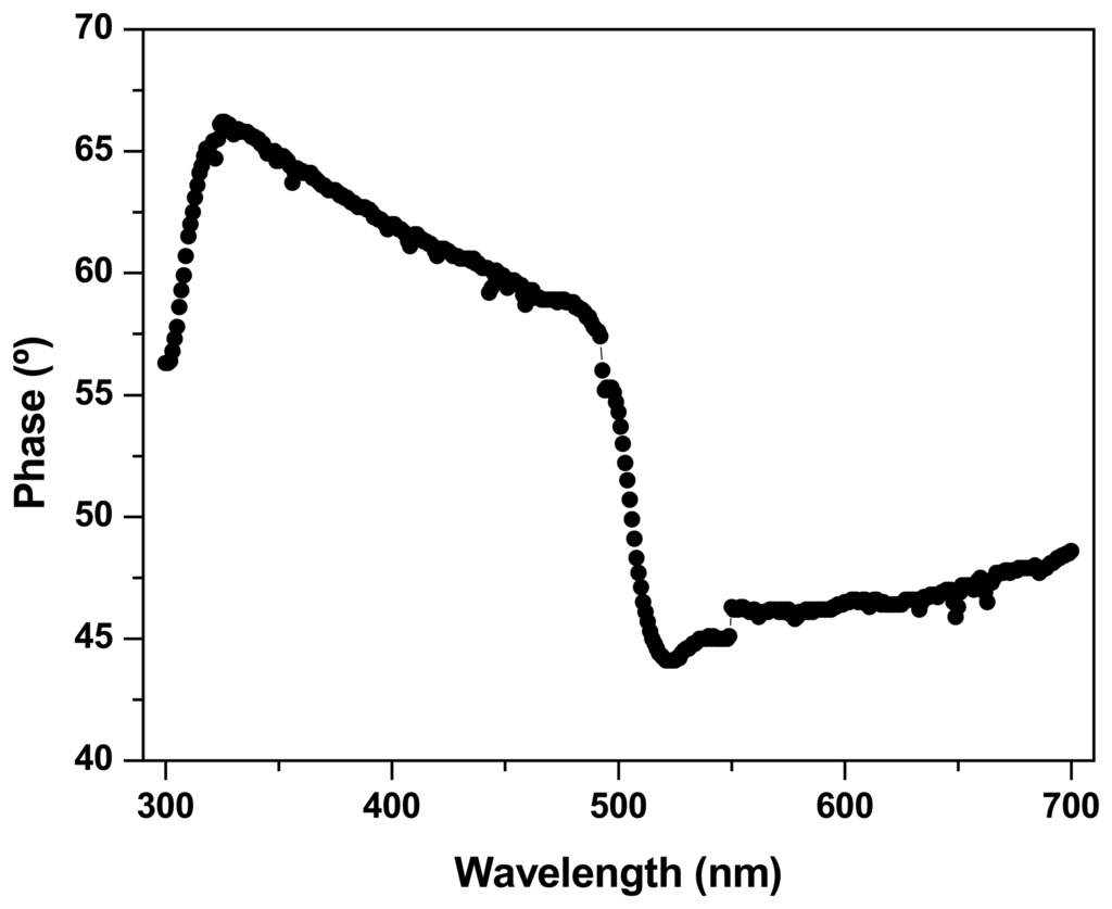 Phase of the reference signal obtained with the LDR. It can be observed a drop in the phase of approximately 15° at about 500 nm. This drop is related to the energy band gap of the semiconductor on the top of the LDR.