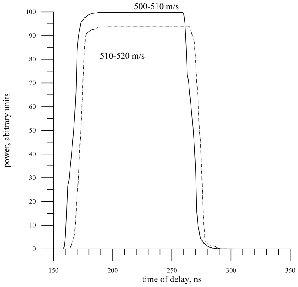 Plots of the received power are shown in Fig.10 for the frequency filter with transmission bands 500-510m/s and 510-520m/s (the pulse duration is 100 ns, the wind speed is 10 m/s. As is seen from the figure, increasing Doppler velocity (i.e. incidence angle) decreases the reflected signal power and shifts the pulse along the time axis.