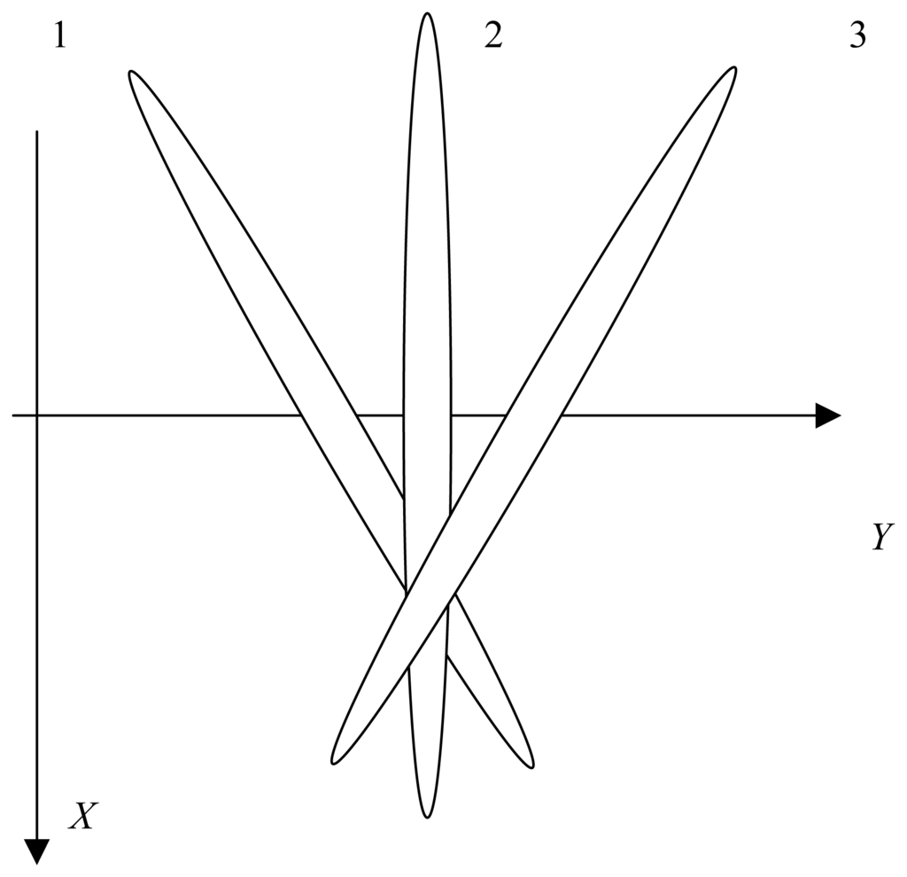 Figure 1 shows the observation scheme. Here θ1, θ2 and R1, R2 are incidence angles and slant distances for two reflecting cells on the sea surface, respectively; H0 is the flight height. The direction of flight is chosen along the Y axis; V is the flight speed. We introduce the second coordinate system X′Y′ related to the antenna: the X′ axis is oriented along the longitudinal axis of the knife-beam footprint and the rotation angle of X′Y′ about the first coordinate system is equal to φ1.