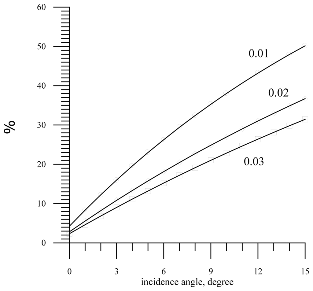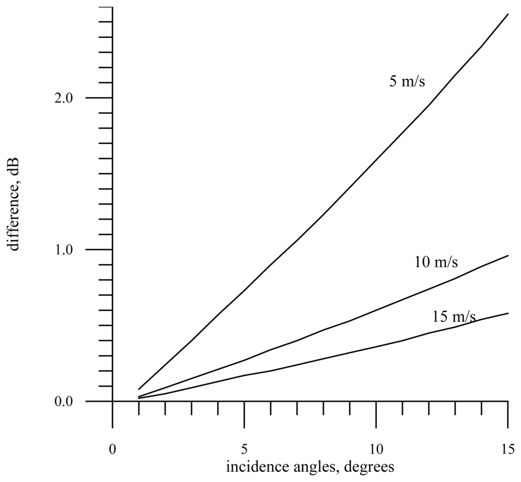 On the basis of these results, we have constructed in Figure 5 the dependence on incidence angle of the backscattering radar cross section difference Δσ0 = σ0(θ0) − σ0(θ0+1) across two neighbouring cells separated by 1 degree. Assuming typical measuring equipment sensitivity and taking into account reflected signal fluctuations, the difference should be more than 0.1–0.2 dB to be detectable [, ].