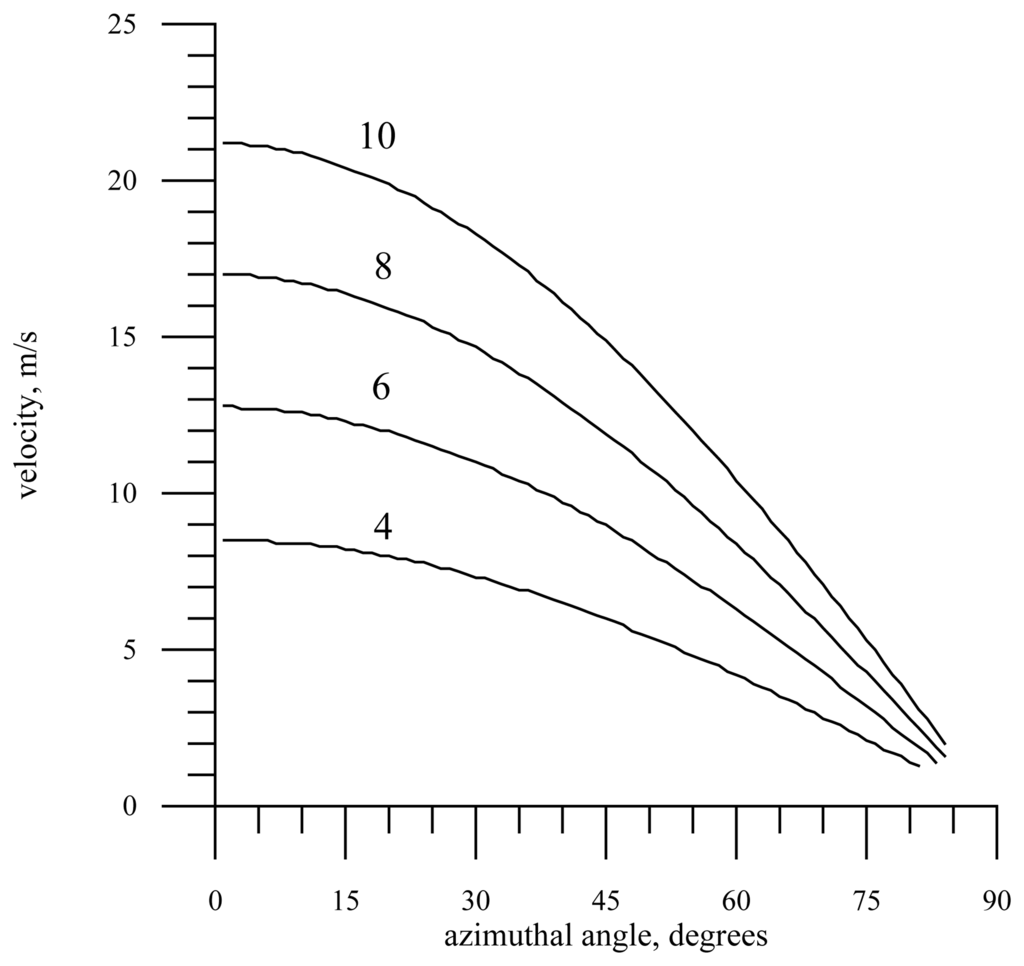 Dependence on azimuth angle φ1 of the change in Doppler shift with azimuth with an elementary cell for several incidence angles (4°, 6°, 8°, 10°).